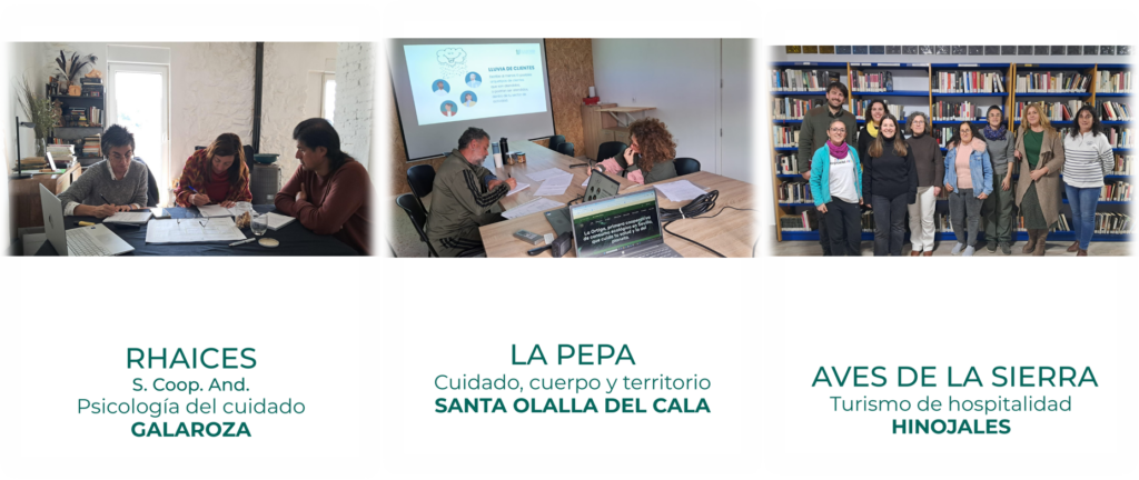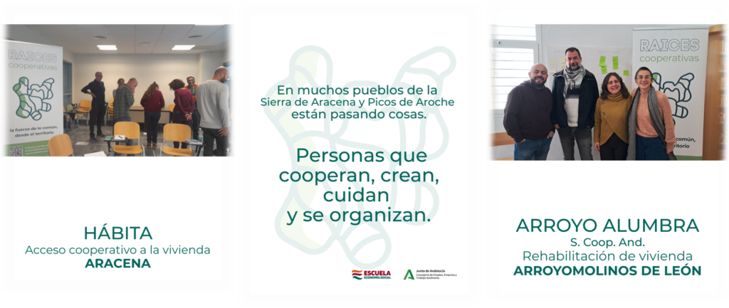 En paralelo, el proyecto está acompañando a iniciativas concretas en fase de exploración, definición o puesta en marcha, vinculadas a ámbitos diversos pero conectados con necesidades reales del territorio. Entre ellas se encuentran Aves de la Sierra, en Hinojales, centrada en turismo de hospitalidad. Arroyo Alumbra S. Coop. And., en Arroyomolinos de León, que trabaja en una propuesta de rehabilitación y acceso a la vivienda. La Pepa, en Santa Olalla del Cala, vinculada al cuidado, el cuerpo y el territorio. Rhaices S. Coop. And., en Galaroza, orientada a la psicología del cuidado. Y Hábita, en Aracena, como iniciativa centrada en el acceso cooperativo a la vivienda.